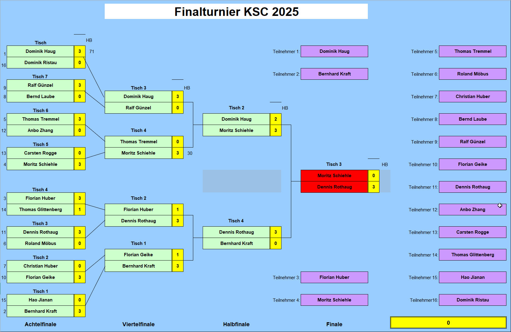 Einmal auf dem Leaderboard im Club mit seinem Namen zu erscheinen, sicher ein Anreiz für manche im Verein. Seit April gab es nun vier dieser Möglichkeiten und im dritten Anlauf schaffte es Moritz nun und ist unser Ranglistenmeister 2025, nachdem es beim Häschencup und der Karlsruher Snookerchampionship (KSC) nur zum zweiten Platz reichte. Bei den Vereinsmeisterschaften konnte er nicht dabei sein. Hier sicherte sich Bakr Sikal gegen Ralf Dahn den Titel.