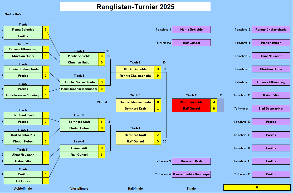 Am gestrigen Ranglistenturnier sicherte er sich den Titel ohne Frameverlust. Ralf Günzel, der an diesem Tag tolle Breaks spielte und damit Bernhard Kraft im Halbfinale 3:2 besiegte, war ebenso nahezu chancenlos wie vorher Ronnie Chalamcharla und Christian Huber.