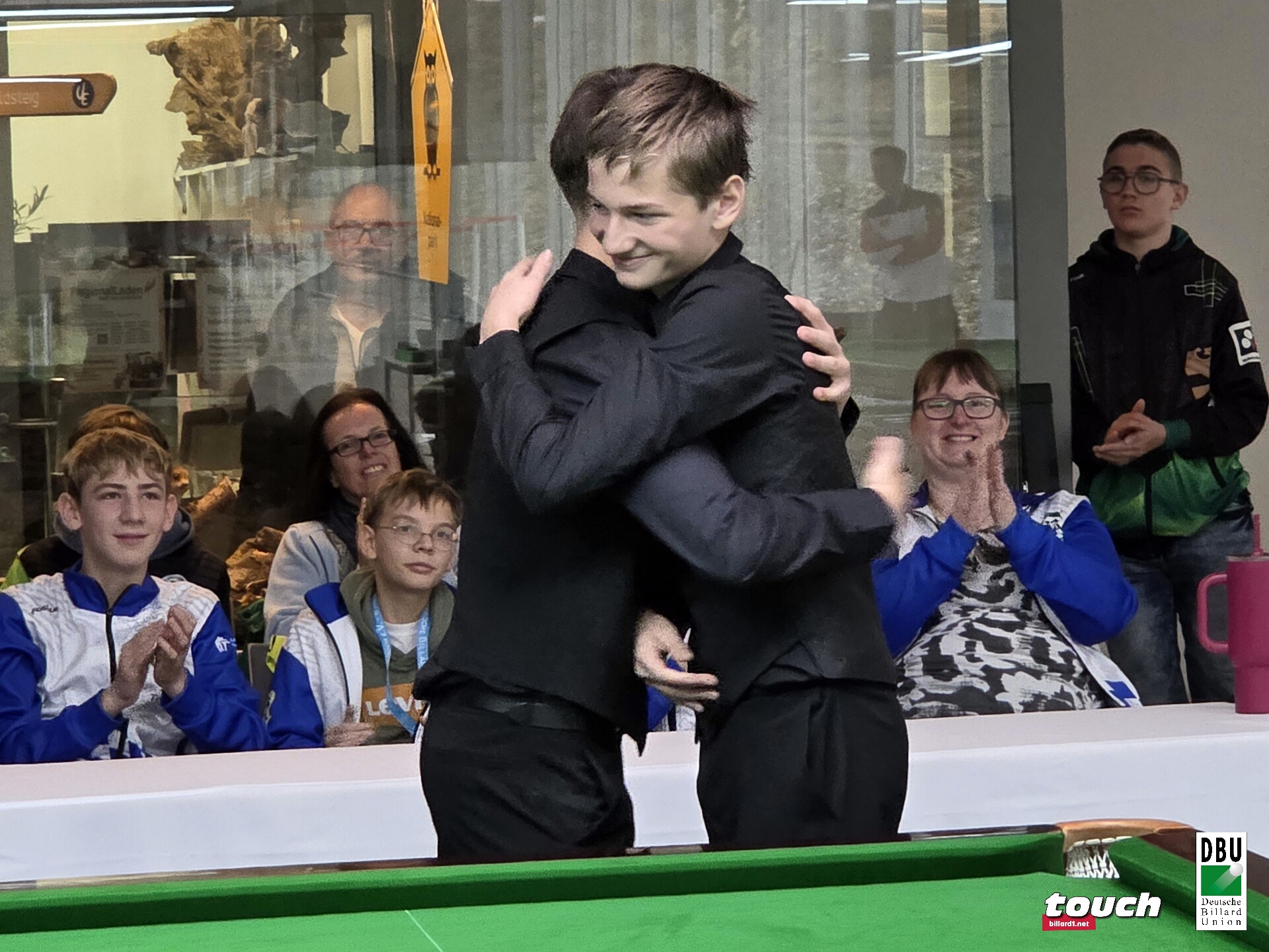 Im Finale gegen Kumpel Felix Breuer (SC 147 München) wurde es dann deutlich schwieriger. Ein paar Lochschwierigkeiten, unglückliche Ablagen und starkes Lochspiel von Felix führten zu einem umkämpften ersten Frame, den sich Moritz nur dank einer verschossenen Schwarzen von Felix noch holen konnte, ehe Felix im zweiten Frame Moritz Schwächen zum Ausgleich nutzte. In Frame drei und vier war Moritz wieder stabiler und so erspielte er sich mit einem 3:1 seine erste Goldmedaille. Bravo!