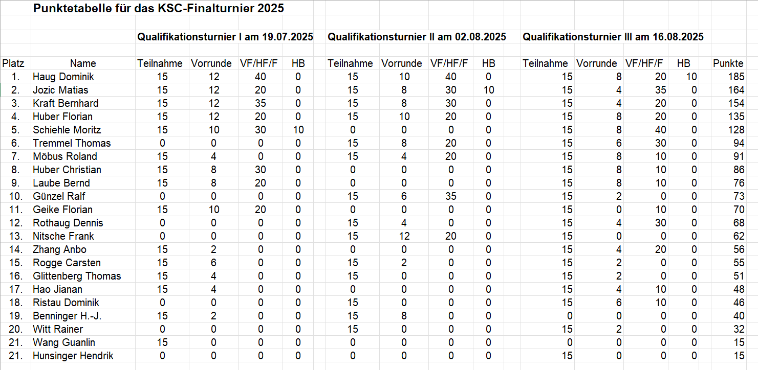 Die Karlsruher Snooker Championship ist eine offene Turnierserie, die bis 2022 von uns in Kooperation mit dem City Club Karlsruhe jedes Jahr ausgerichtet wurde. Die Austragung 2023 findet nur bei uns statt. In drei Qualifikationsturnieren kann man sich Punkte erspielen. Die 16 Punktbesten spielen dann das Finalturnier.